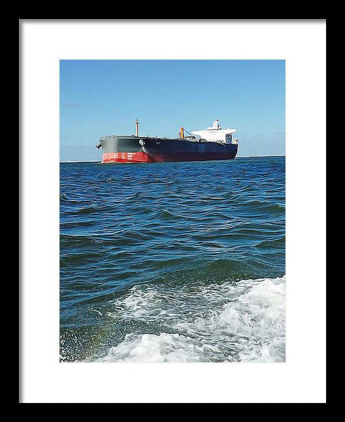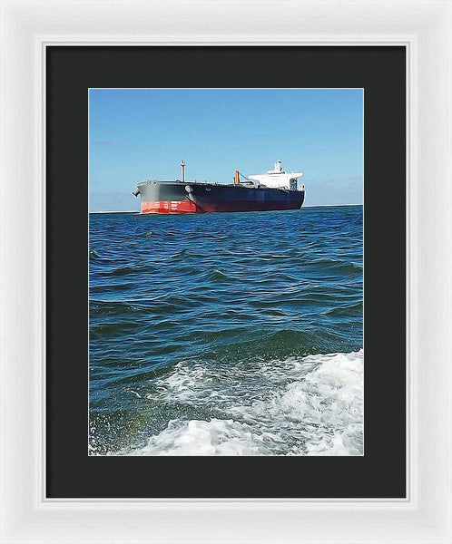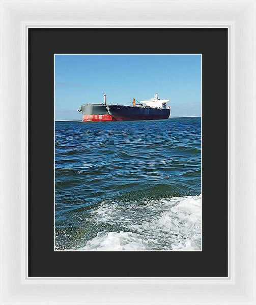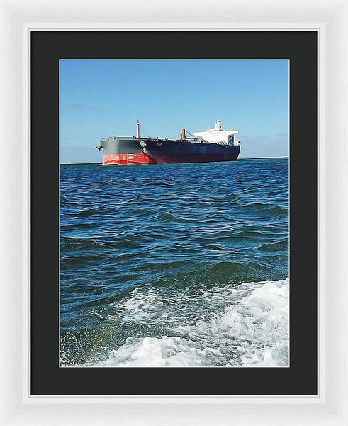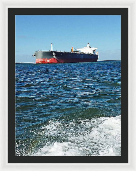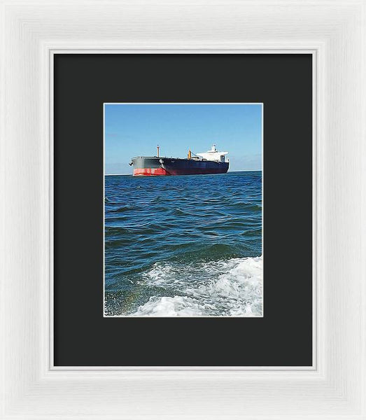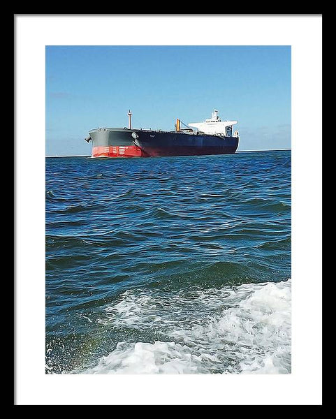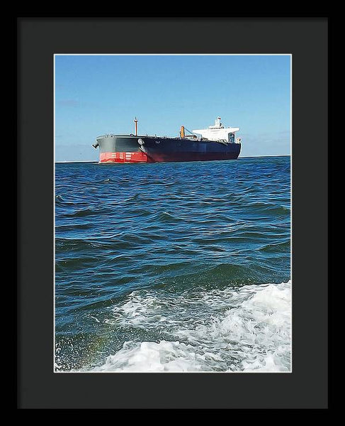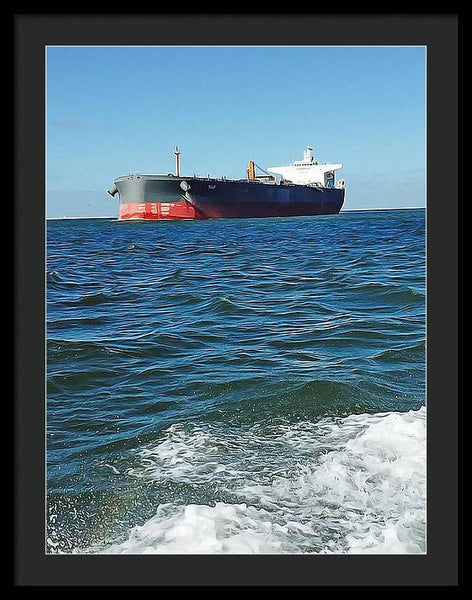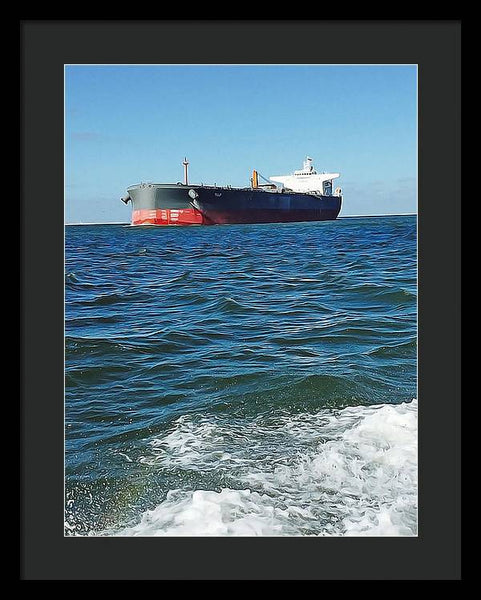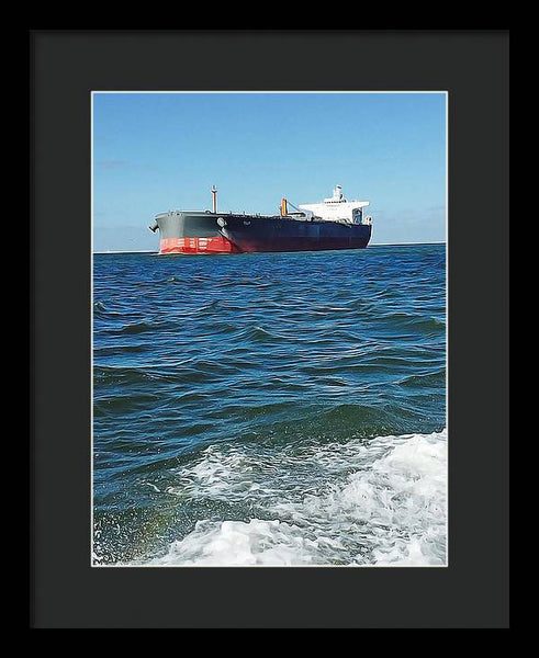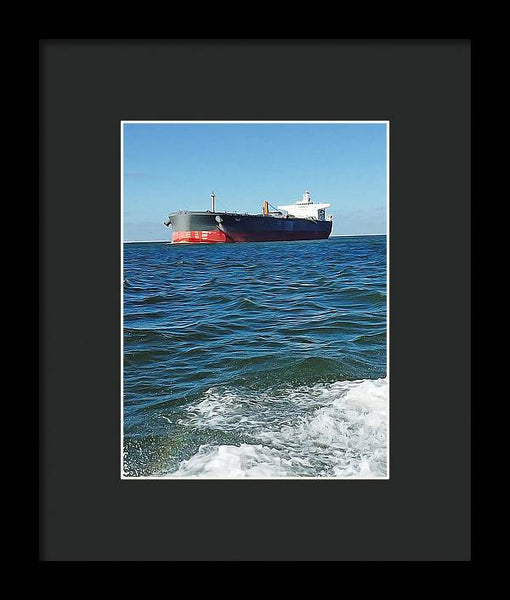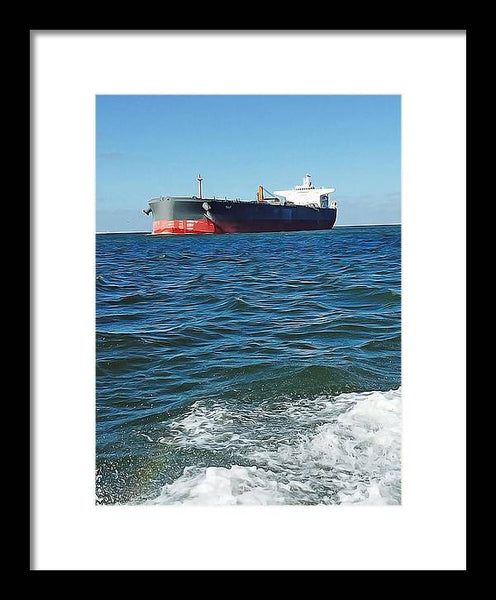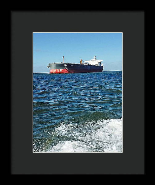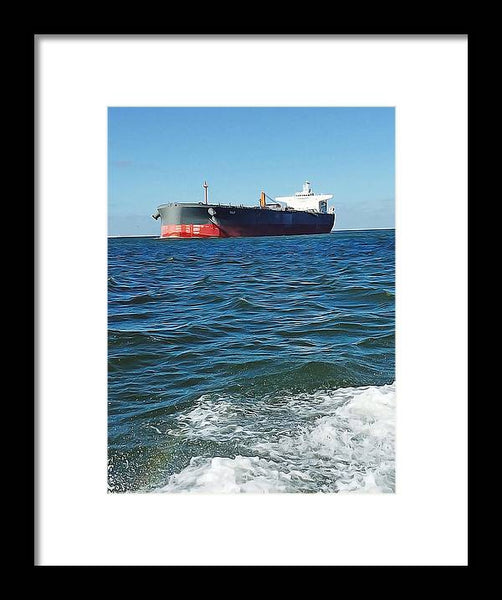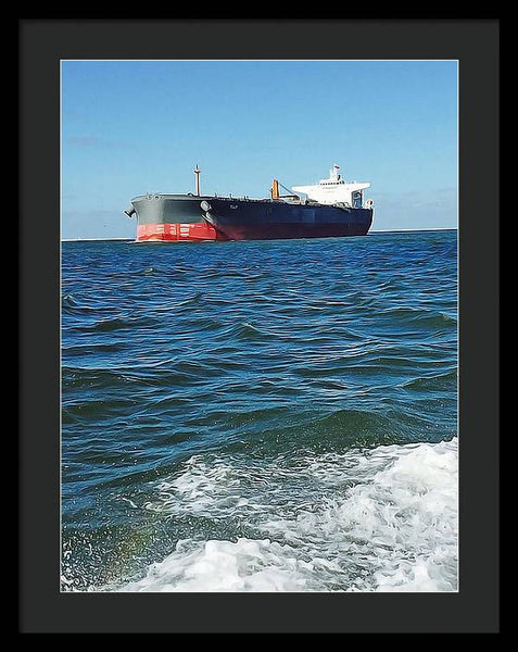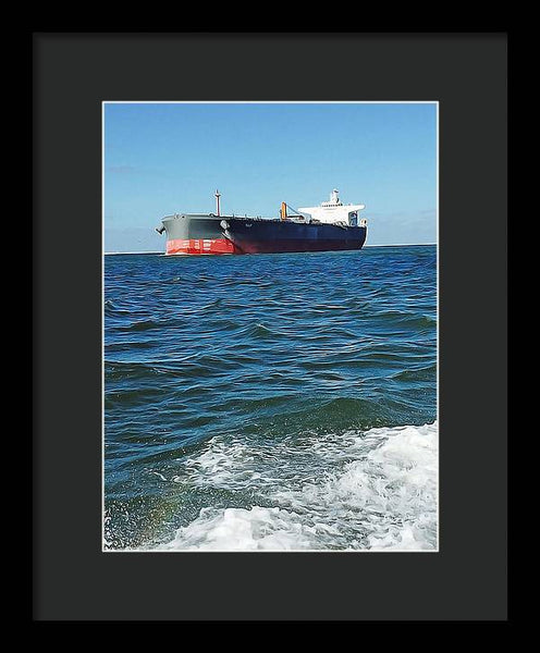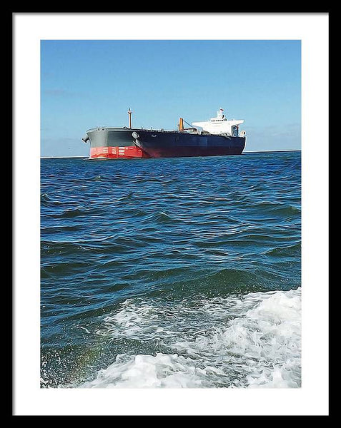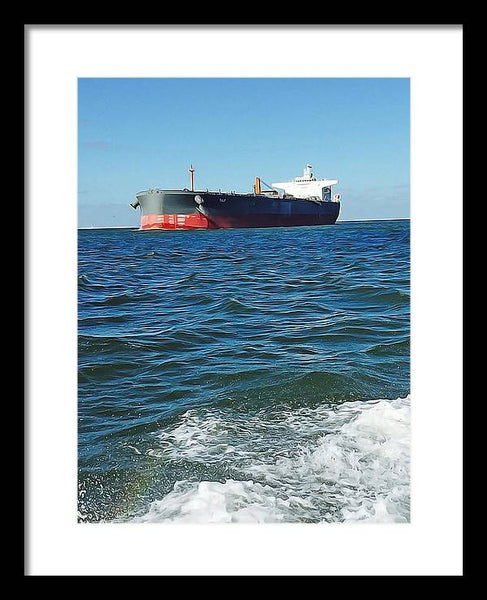 Black And Red Boat At Sea - Framed Print