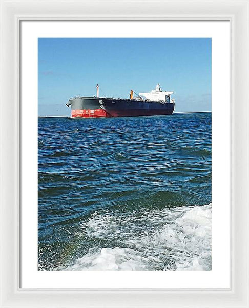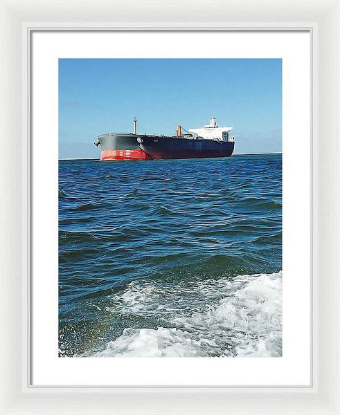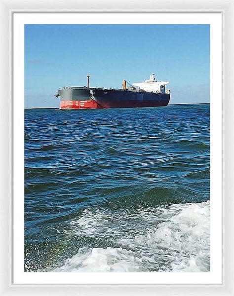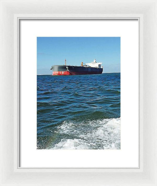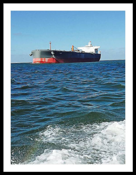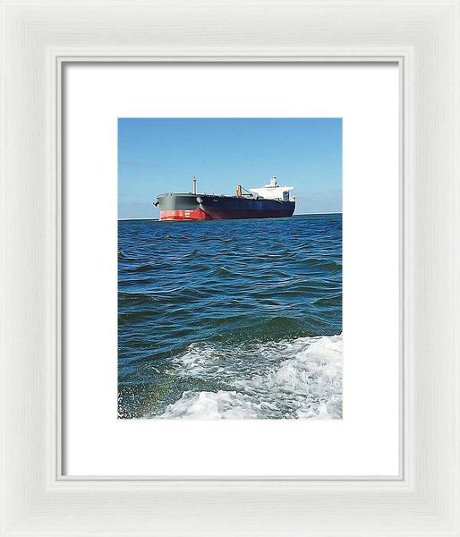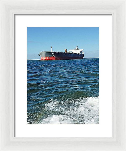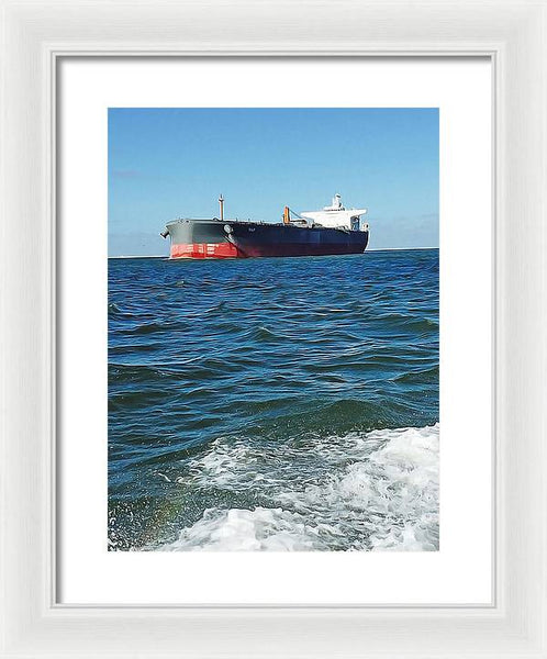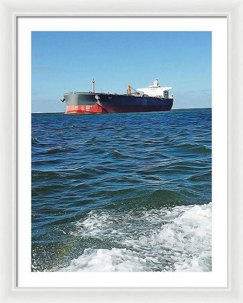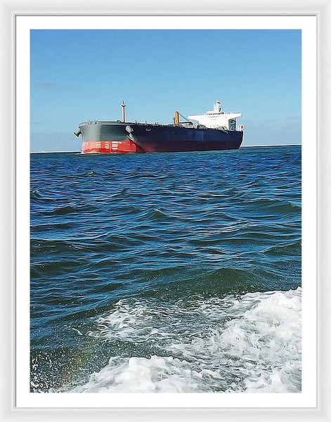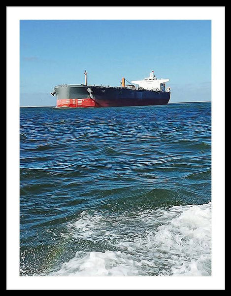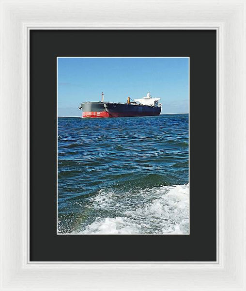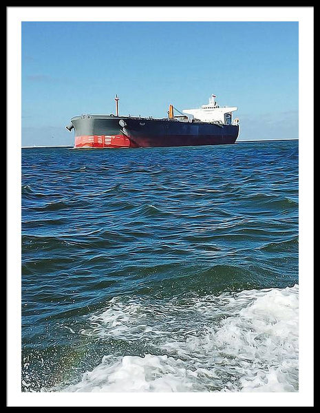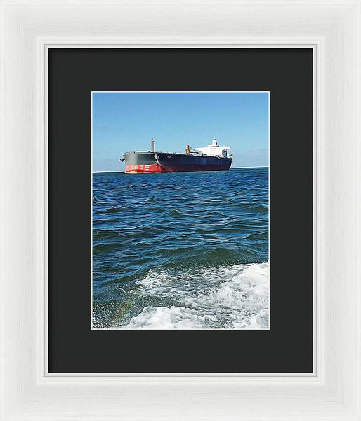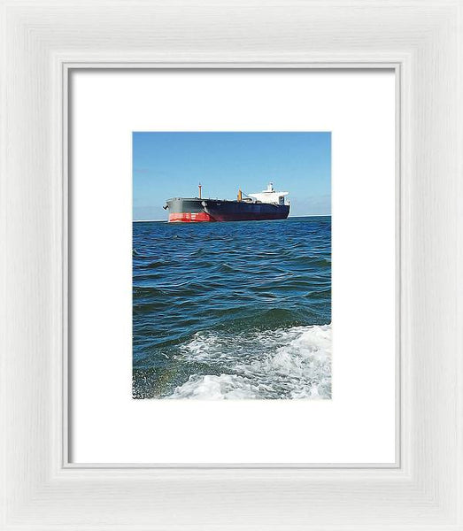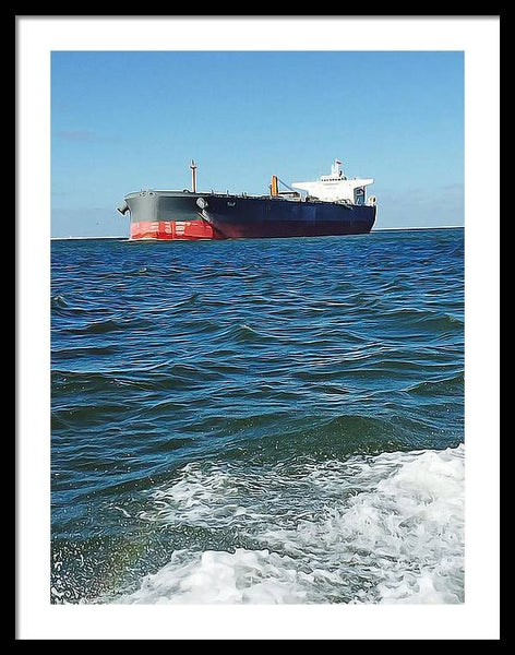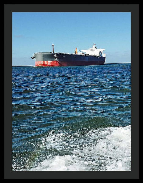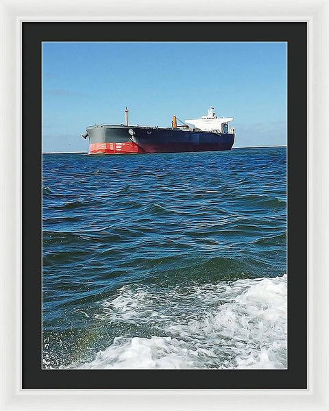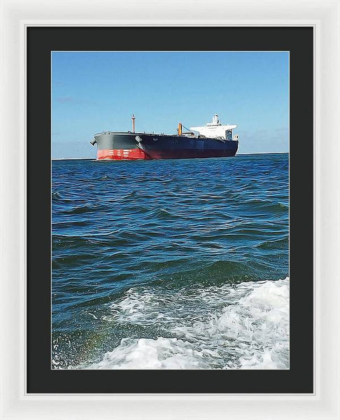 Black And Red Boat At Sea - Framed Print